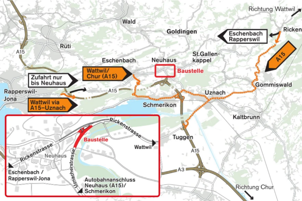 Von Freitag, 12. September, 20 Uhr bis Montag, 15. September, 5 Uhr ist der Knoten Rickenstrasse/Uznacherstrasse von Wattwil Richtung Eschenbach sowie vom Autobahnanschluss Neuhaus (A15) Richtung Wattwil befahrbar. Alle anderen Fahrtrichtungen sind gesperrt.